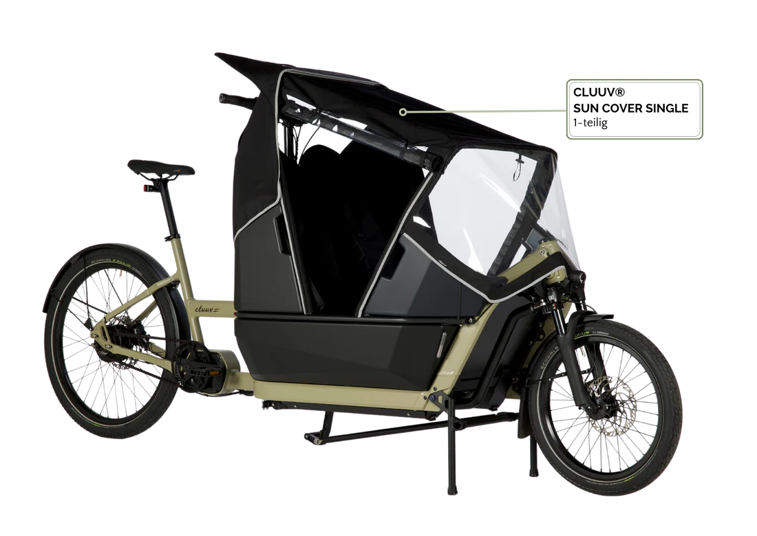 Das cluuv® sun cover SINGLE st die ideale Ergänzung für unsere cluuv® cargobikes und bietet den kleinen Passagieren zusätzlichen Komfort und Schutz bei Ausflügen.