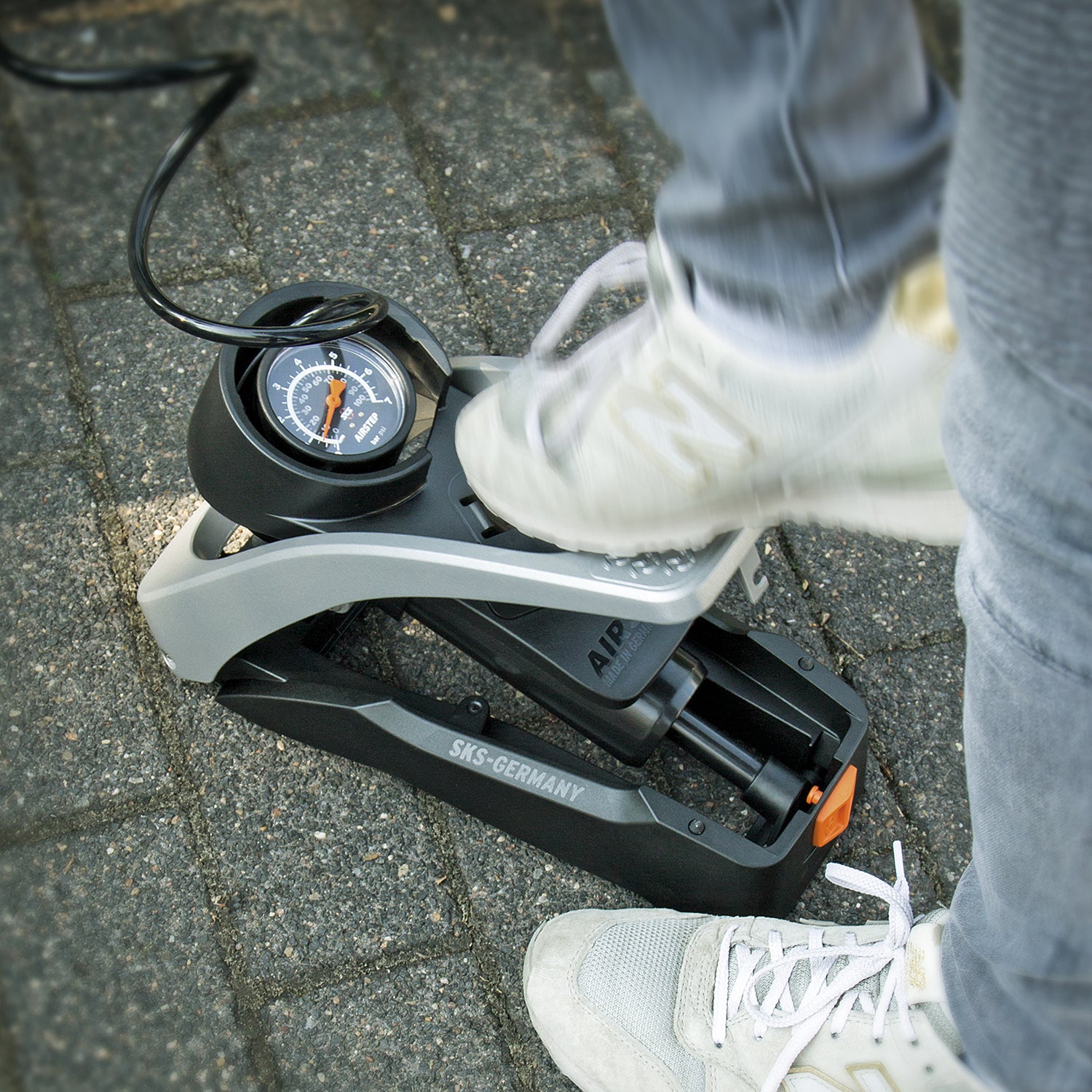 Toller Auf-Tritt: Die Fußpumpe AIRSTEP mit großem, gut ablesbarem Manometer vereint erstklassige Materialien und eine durchdachte Konstruktion. Für ein bequemes Aufpumpen sollte die AIRSTEP mittig am Fahrrad positioniert werden. Von hier aus lassen sich Vorder- sowie Hinterreifen dank des langen Spiralschlauchs mit dem MULTI VALVE-Kopf verbinden.