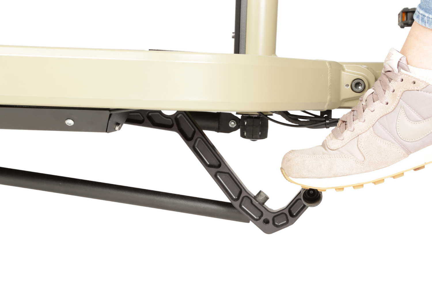 Der clevere Ständer im vorderen Bereich der Cargo-Box balanciert das cluuv® e-cargo perfekt aus und wird mit einem bequem erreichbaren Fußpedal bedient. Dies ermöglicht ein leichtes Abstellen und einen sicheren Stand für das Cargobike, auch wenn sich die Kinder in Richtung Vorderrad bewegen. Eine Gasdruckfeder